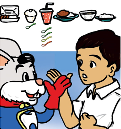 និងចំណីផ្សេងៗទៀត។ អូ! ប្អូនបានញាំចំណីដែលមានស្ករច្រើនណាស់។ មើលចុះ ធ្មេញរបស់ប្អូនមិនល្អទេ!"