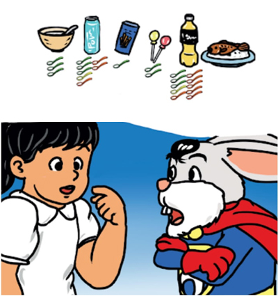 ប្អូនបានញ៉ាំចំណីដែលមានជាតិស្ករច្រើនណាស់។ ប្អូនមិនគួរញ៉ាំទឹកក្រូចកំប៉ុងទេ។ មើលចុះ
