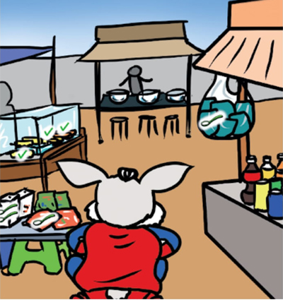 ប្អូនបានញ៉ាំអ្វីខ្លះ? បាទ! ខ្ញុំបានញ៉ាំបាយ នំផ្អែម ទឹកក្រូចកំប៉ុង និងចំណីផ្សេងៗទៀត។