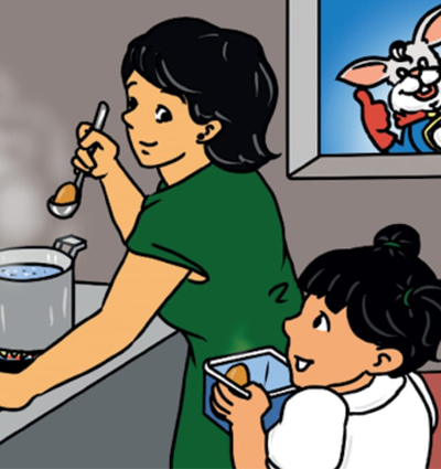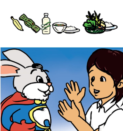 ម៉ាក់! ខ្ញុំរីករាយណាស់ដែលបងទន្សាយប្រាប់ខ្ញុំអំពីចំណីដែលល្អសម្រាប់សុខភាព។